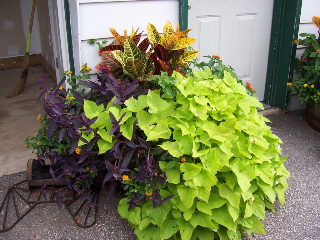 - Ипомея батат в композициях будет выигрышно смотреться только на хорошо освещенных участках при температуре выше +20℃. Если на улице температура ниже, то ампельные растения лучше держать в доме, теплице или на закрытом балконе.