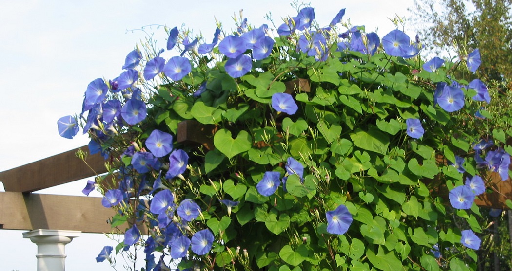 Хорошо смотрится цветущая ипомея на высокой перголе