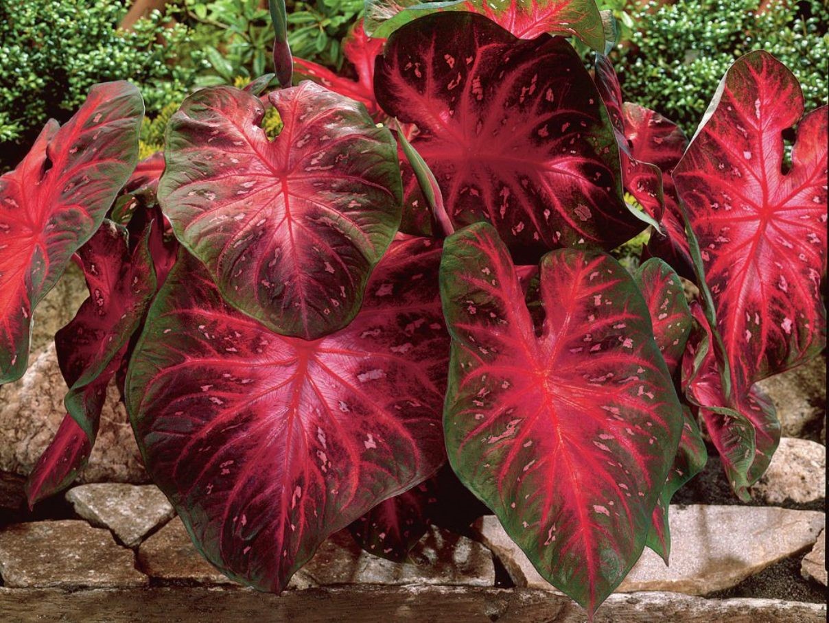 — каладиум с красно-зелеными листьями, окраска которых включает в себя переход от красно-алого центра и белых жилок до розовато-зелёной каймы. -