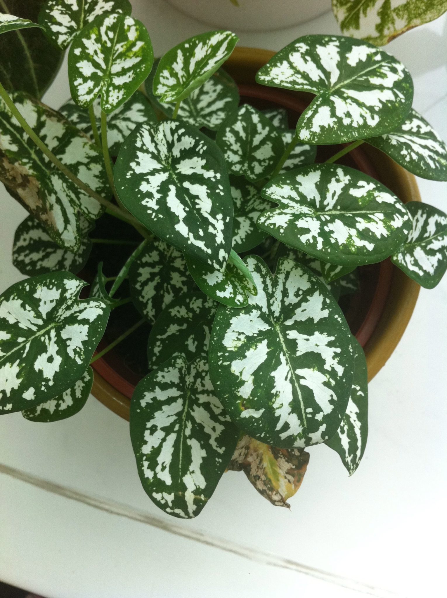 — великолепный каладиум с тёмно-зелёными жилками на белой поверхности листа, украшенной тёмно-зелёными пятнышками или без них.