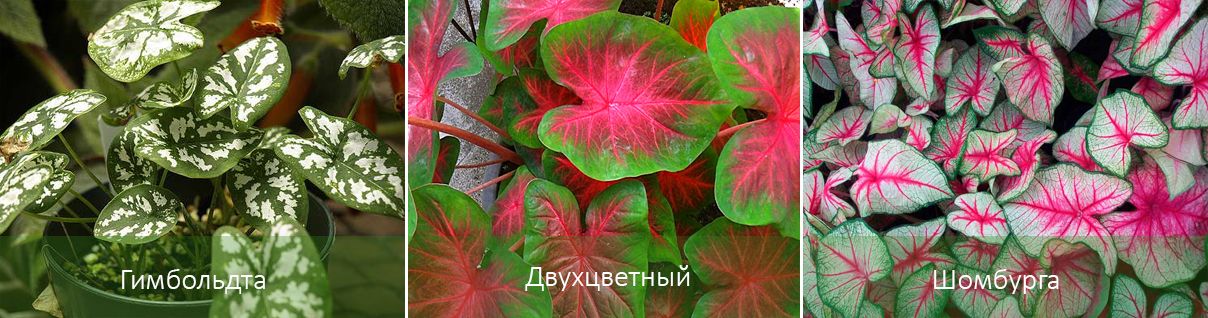 Каждый вид и сорт из рода caladium имеет свои отличительные особенности, которые лучше всего видно на фотографиях.