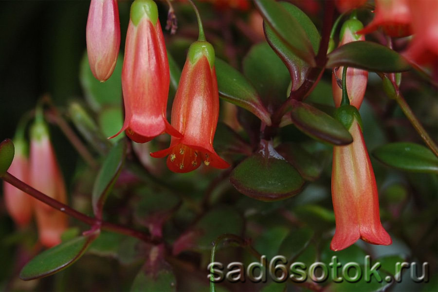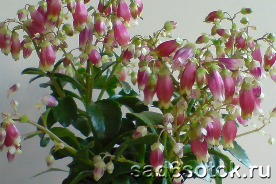 У него сочные листья и достаточно крупные красно-фиолетовые колокольчатые цветки. Они собраны в соцветия, появляющиеся весной. Научное название вида – к. пурпурночашечковое (K. рorphyrocalyx). Его большой недостаток – усиленный рост после того, как действие тормозящих веществ, используемых в производственных оранжереях, заканчивается. Проще говоря, через некоторое время после того, как вы принесете его из магазина, он начнет вытягиваться и терять компактность. Его придется ежегодно омолаживать, выращивая летом из черенков. Имеются и другие каланхоэ с колокольчатыми цветками.