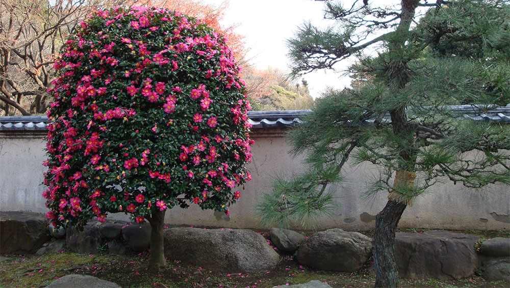 Японская. Часто растет как кустарниковая, но бывает и древовидная, достигая высоты 11-13 м. Имеет яйцевидные глянцевые листья, иногда принимающие форму эллипса, заостренные по краям. Мелкие или крупные цветки диаметром от 4 до 12 см могут быть собраны по 3-4 штуки или распускаться одиночно, радуя владельца своим видом с декабря по март.