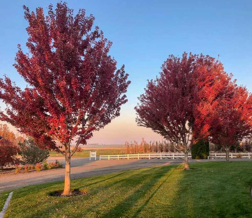 Красный | Гибрид из сортов Autumn Flame и October Glory, бессемянной. Среднерослое дерево имеет красивую декоративную крону. Взрослое растение около 9 м, старое может вырасти до 15 м. Крона овальная около 10 м. Осенняя листва яркая, сохраняется до 2 недель. Листья окрашены в красновато-зеленый цвет, соцветия имеют красноватый оттенок. Цветет в апреле-мае. | Используется в ландшафте для посадки одиночно или в группе, для создания сезонных аллей и композиций. |