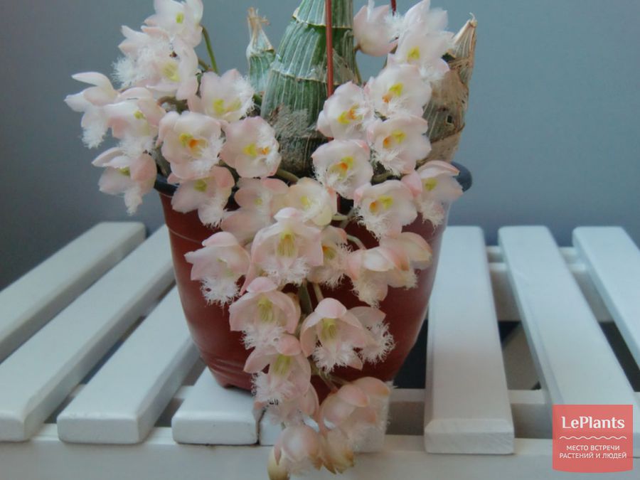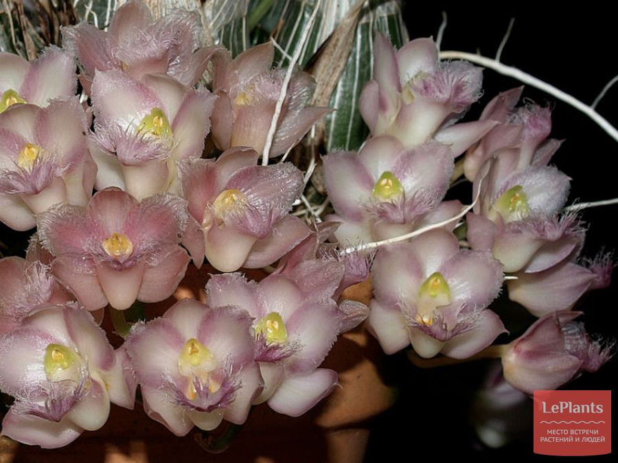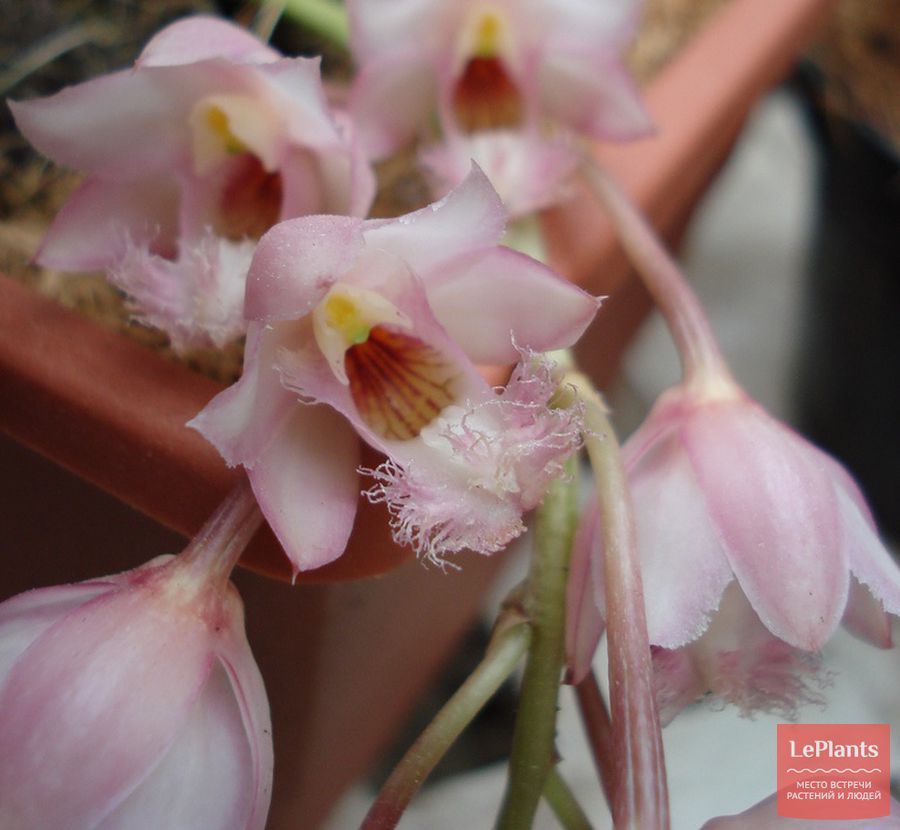 Один или несколько ампельных цветоносов вытягиваются от основания безлистных псевдобульб.
