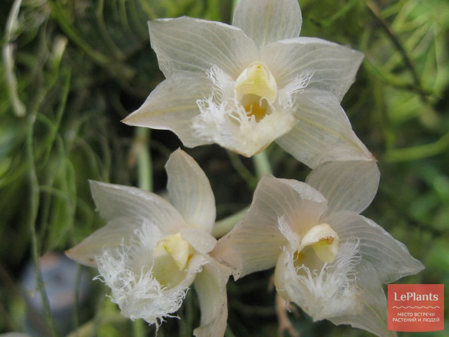 Цветки обладают приятным запахом, в зависимости от видовой принадлежности бывают кремовыми, розовыми, сиреневыми, зелеными. Сепалии и петалии почти прозрачные с хорошо различимыми жилками, трехлопастную губу украшает бахрома.