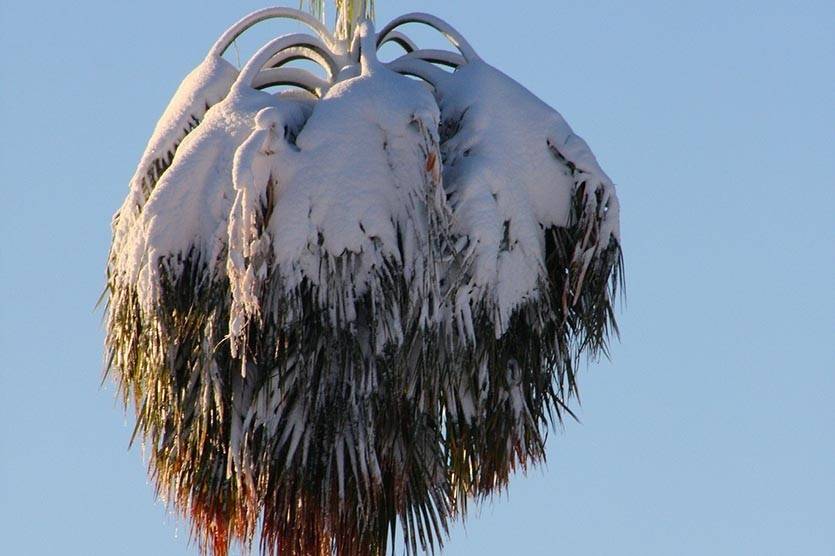 - В любом случае, эта пальма переносит мороз только в «режиме качелей» — ночные заморозки должны сменяться дневными оттепелями. Оптимально для нее ночью —5 °С, днем +15 °С.