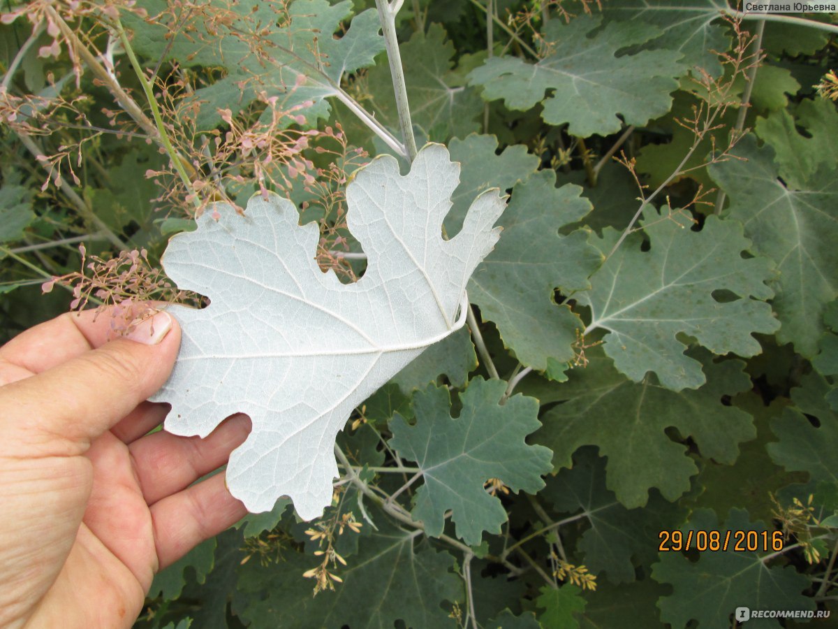 Листья крупные, длиной до 20-30 см, по форме пальчатолопастные, к стеблю крепятся на длинных черешках, сверху серо-зеленые, снизу белесые.