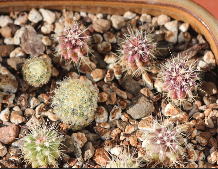 A mini cactus garden is a good way to display several different varieties of Mammillaria indoors!