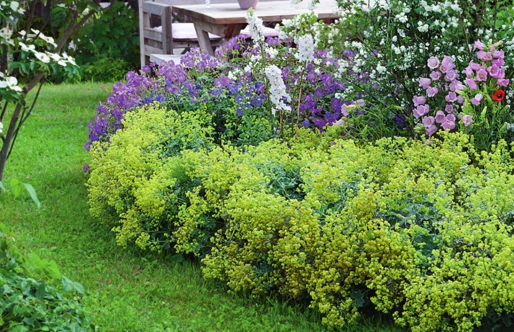 Манжетка в цветнике с садовыми растениями. Фото автора