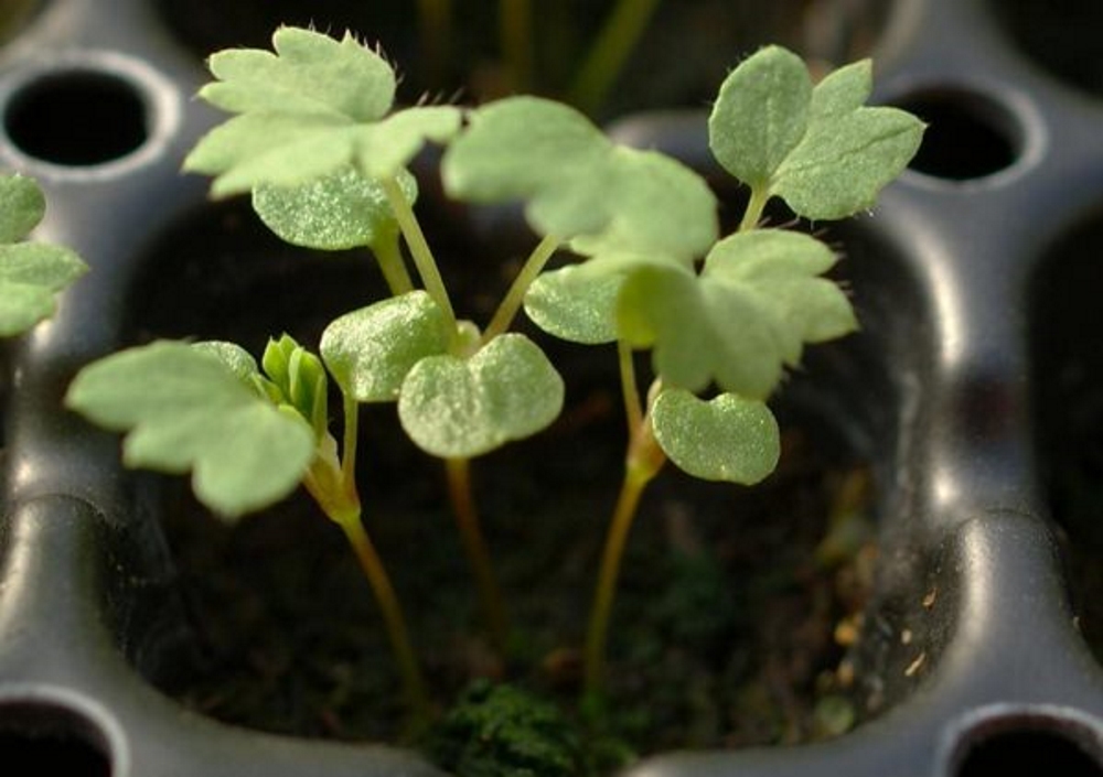 - Размножение манжетки семенами. При этом рекомендуется поместить в ноябре семенной материал в посадочный ящик, наполненный торфяно-песочным грунтом или субстратом для выращивания рассады. На дно перед этим следует насыпать дренажный слой, которым выступать может мелкий керамзит, щебень или галька. Поскольку семена мелкие, то глубина задела выдерживается не более 7–10 мм. Спустя две недели, емкости с посевами переносят в теплицу без отопления или же ставят на улицу, но в этом случае потребуется организовать защиту от непогоды, порывов холодного ветра (сквозняка) или прямых лучей солнца. Таким образом, семена пройдут естественную стратификацию, и когда наступит весна, то ящики переносят снова в помещение, и вскорости можно будет увидеть дружные всходы медвежьей травы. По истечении еще 20-ти дней, выполняется пикирование сеянцев манжетки по отдельным горшочкам с торфяно-песочной почвой. Обычно показателем готовности к пикировке выступает наличие 2–4 листочков у растеньиц. Лучше всего горшочки использовать выполненные из прессованного торфа, тогда пересадка на клумбу не принесет малейших затруднений. Когда произойдет достаточное разрастание корневой системы сеянцев недужника, их пересаживают в открытый грунт. Обычно этот момент наступает в апреле-мае. Можно проводить посев в марте, но при таком решении необходимо самостоятельно выдержать семенной материал при температуре 0–5 градусов долгое время, не менее месячного срока — провести стратификацию. И только после этого с приходом апреля-мая посеять семена на подготовленную грядку. В любом случае цветение наступит полученных растений в этот же год.