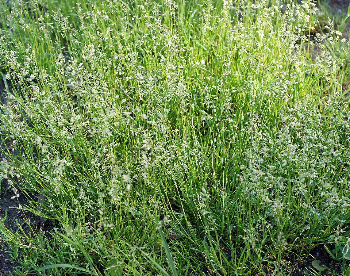 - Мятлик однолетний – цвет до самых морозов. Хорошо переносит стрижку, однако жара на него действует негативно: растение желтеет и начинает выпадать.