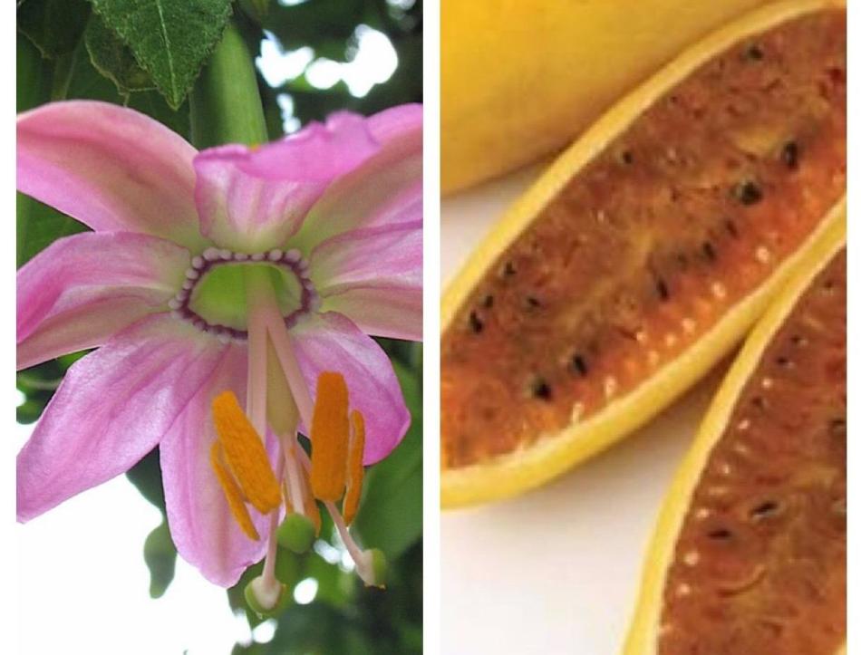 Пассифлора нежнейшая (Passiflora mollissima), Банановая гранадилла, Страстоцвет мягчайший. Цветки 7-8 см в диаметре, розовой окраски, без запаха. Плоды 6-12 см длины с ароматной мякотью. Съедобны.