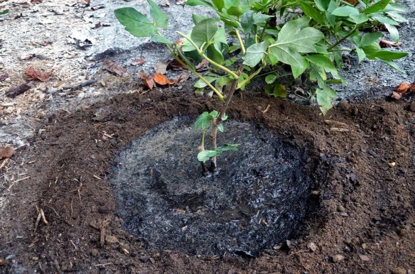 Куст окапывается по кругу, на расстоянии 20-30 см от точки роста