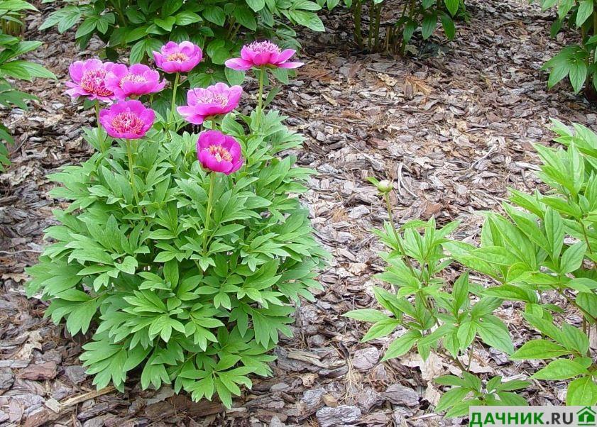 При выборе площадки для видовых пионов стоит предупреждать малейший риск застоя воды или выгорания растений. Предпосадочное улучшение почвы обычно сводится к внесению органических удобрений и перекопке. Внесение порции фосфорных и калийных удобрений в стандартном количестве позволяет обходится без подкормок.