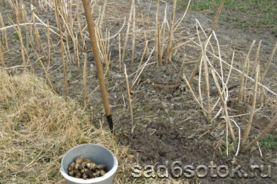 Клубни можно собирать как поздней осенью, так и ранней весной. Одним из главных признаков, когда приходит время выкапывать топинамбур, считается слегка промерзшая земля. Это касается и весеннего урожая, иначе клубни прорастут и превратятся в сорняки.