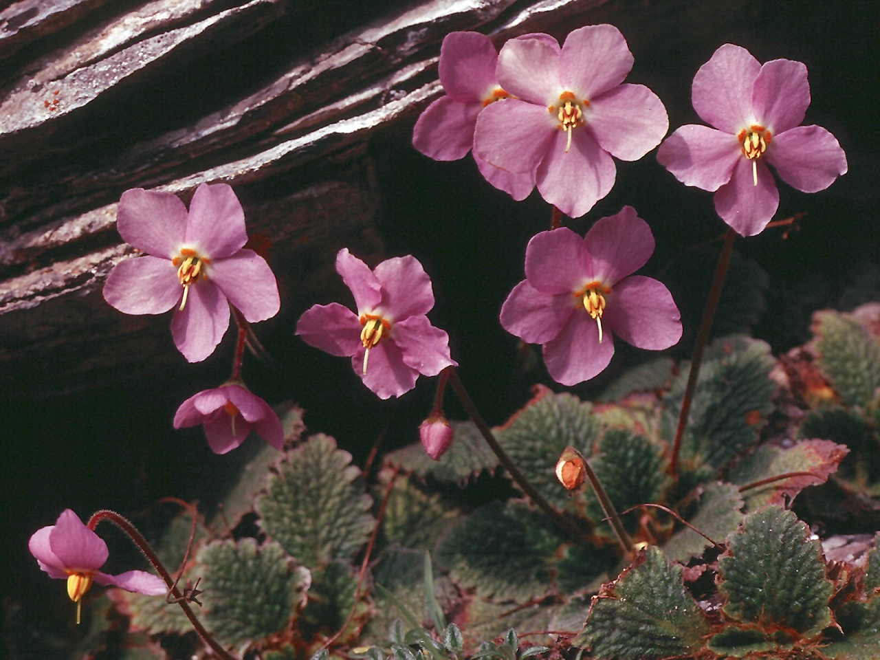 Берущий начало с Третичного периода древнейший род Рамонда (Ramonda) насчитывает всего три редких в природе вида невысоких вечнозеленых многолетников из семейства Геснериевых. Культуру можно встретить в каменистых районах юго-восточной Европы, в основном в Пиренеях, где растение произрастает в тенистых расщелинах отвесных скал. Род назван в честь французского ботаника и исследователя Луи Рамонда де Карбоннира, который был одним из первых исследователей высоких Пиреней. Миниатюрный выносливый многолетник образует розетку из опушенных темно-зеленых листочков, которые при недостатке влаги кажутся безжизненными, сморщиваются и сворачиваются. Но с приходом дождей листья снова оживают. По мере роста в период вегетации образуется несколько новых листочков, а старые отмирают. Весной или в начале лета на невысоких до 10-12 см цветоносах распускаются одиночные цветы. В культуре чаще всего встречаются два вида: рамонда миконская (R.