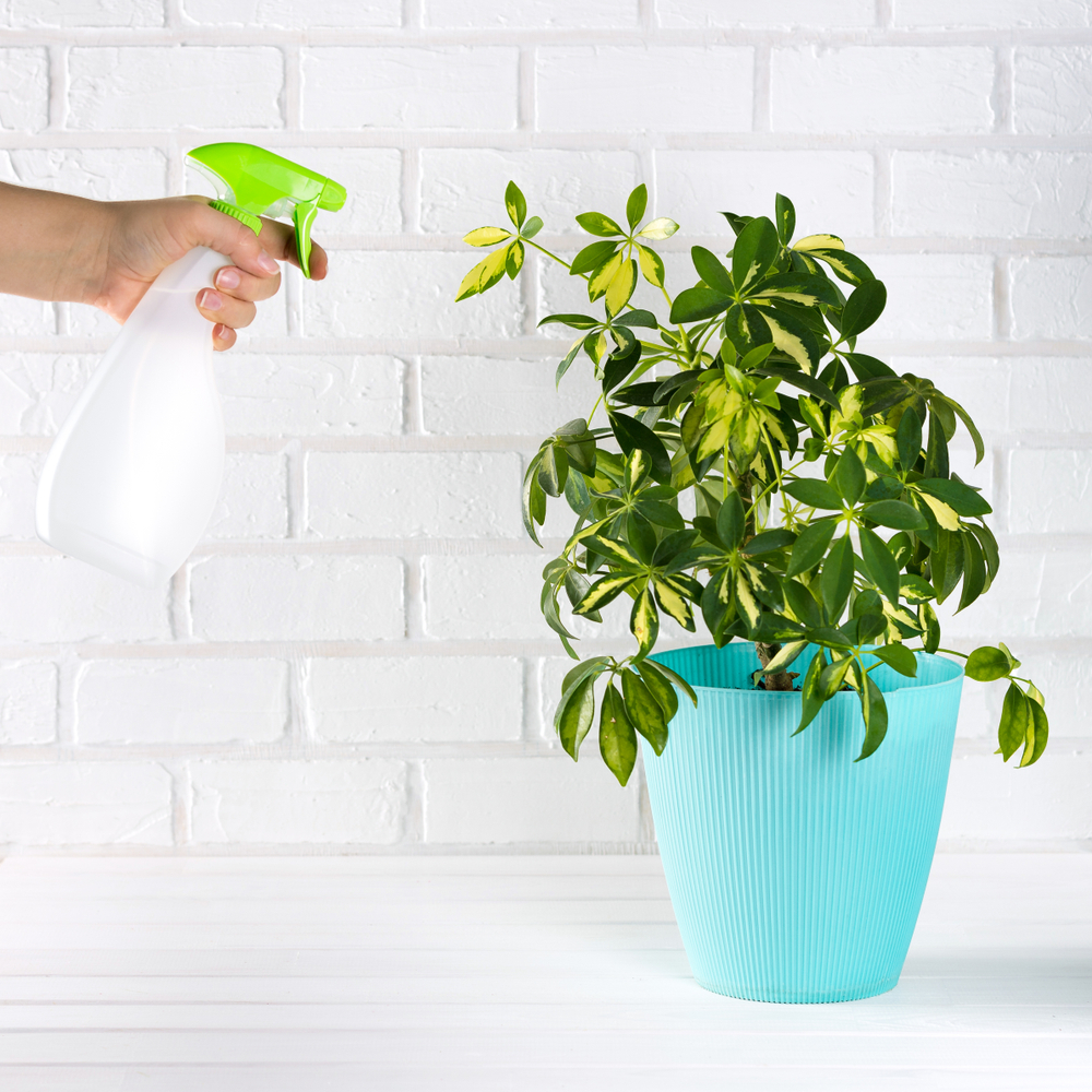 Шефлера положительно реагирует на опрыскивание мягкой теплой водой. Особенно полезно оно летом и в зимнее время, когда воздух в помещении особенно сухой. В природе растение растет в тропических лесах, где влажность воздуха в среднем составляет 65%. При отсутствии возможности ежедневно опрыскивать куст можно ставить рядом с ним наполненную водой емкость.