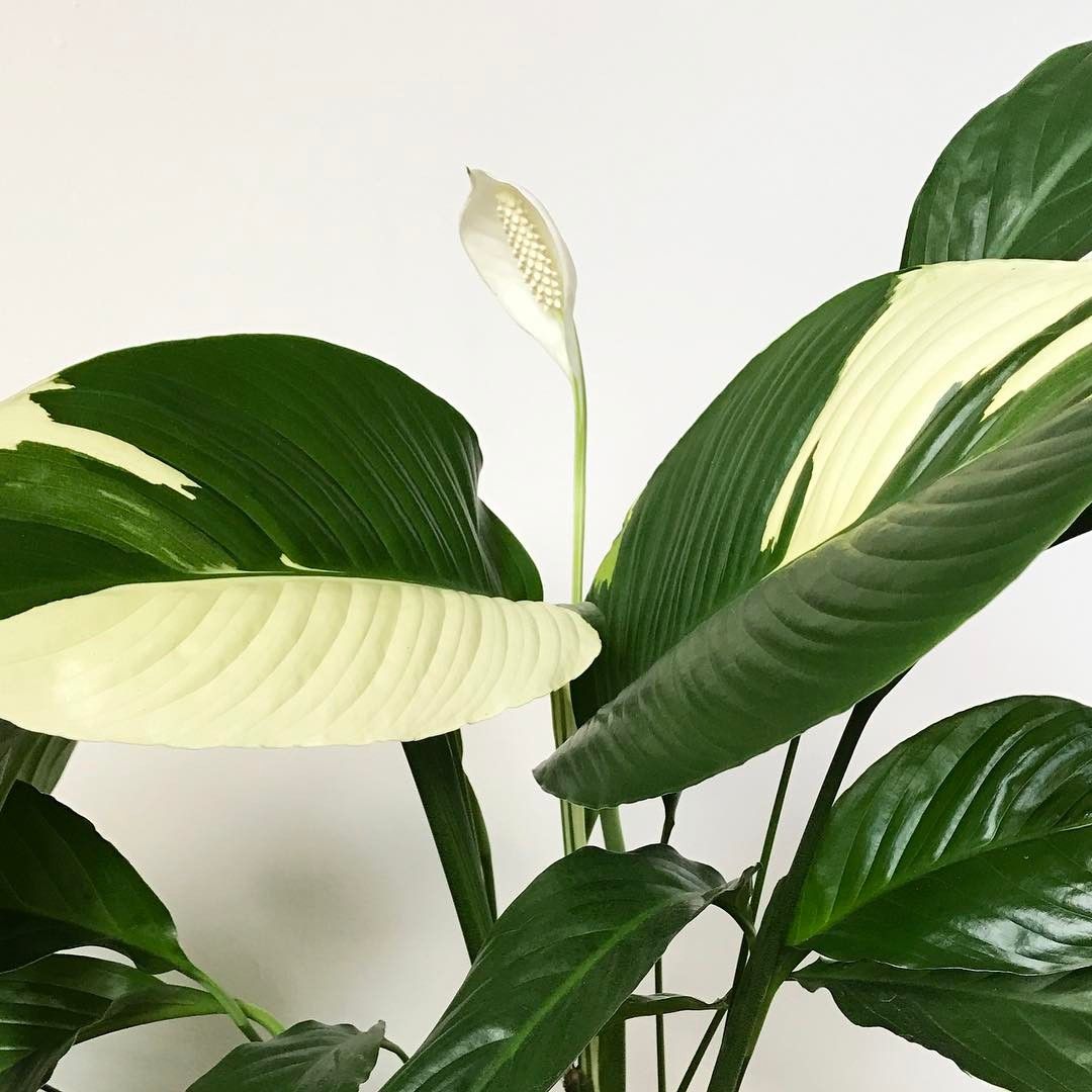 Новый сорт спатифиллума «Домино» имеет белые соцветия и эффектную пеструю листву, в продаже популярна его вариегатная форма.