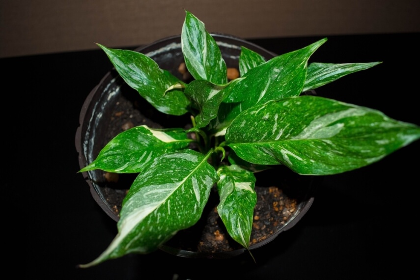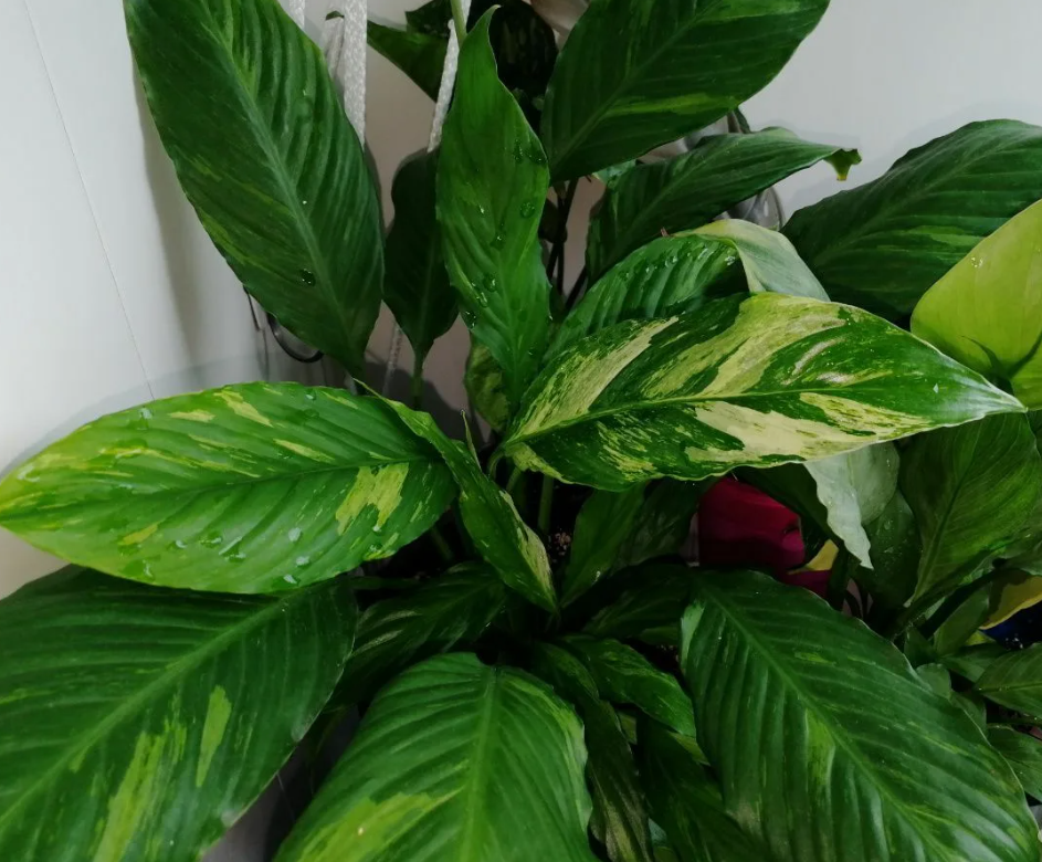Пестролистый сорт спатифиллума «Джемини» (Gemini). Темно-зеленая листва окрашена в белые полосы и пятна.
