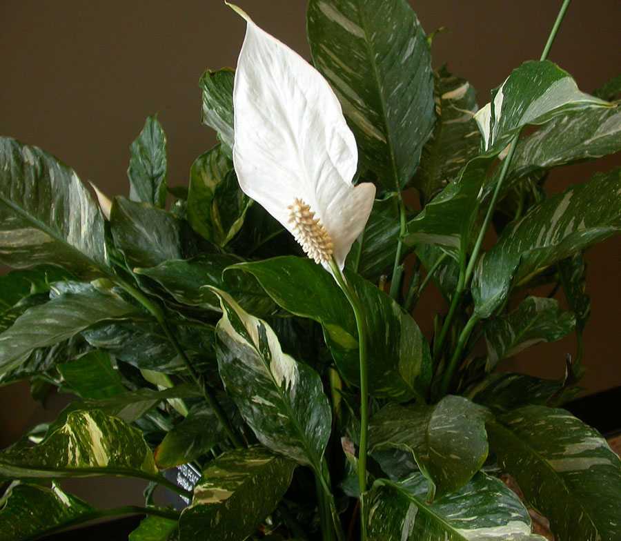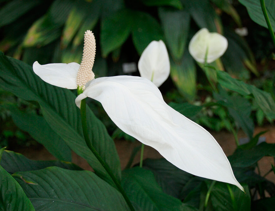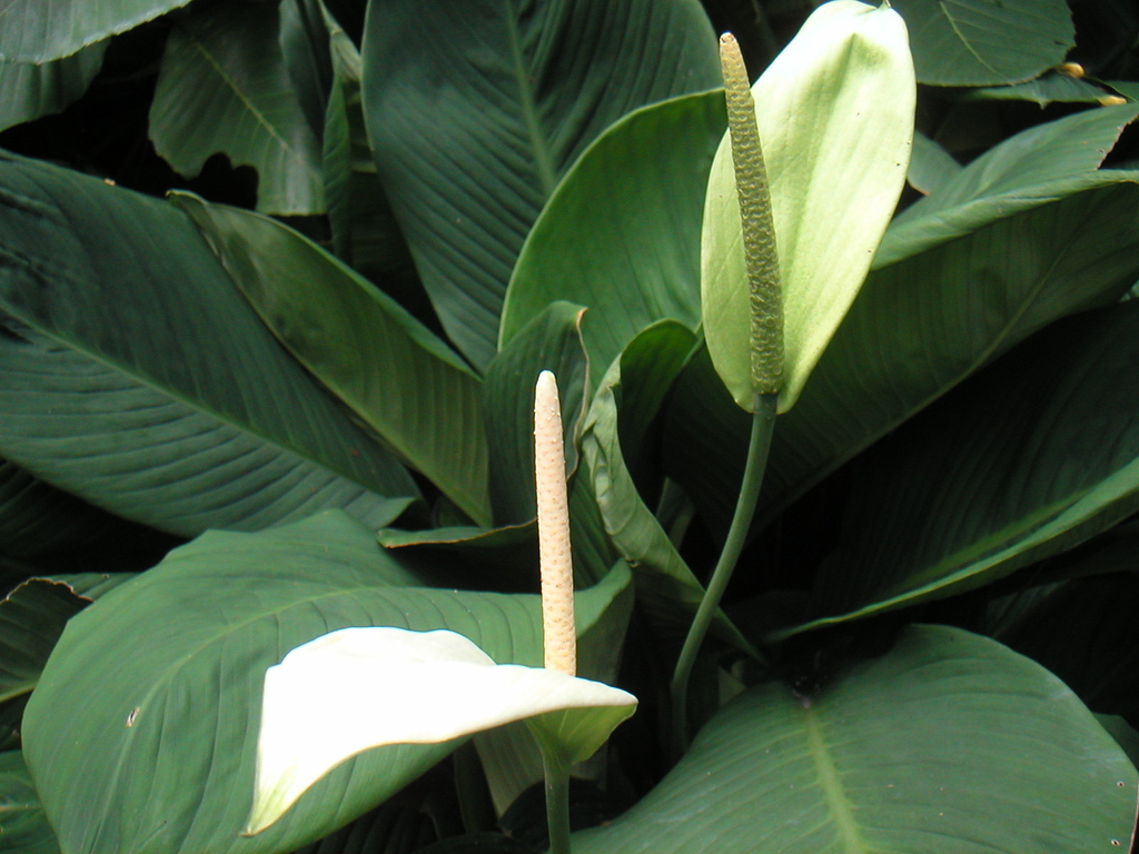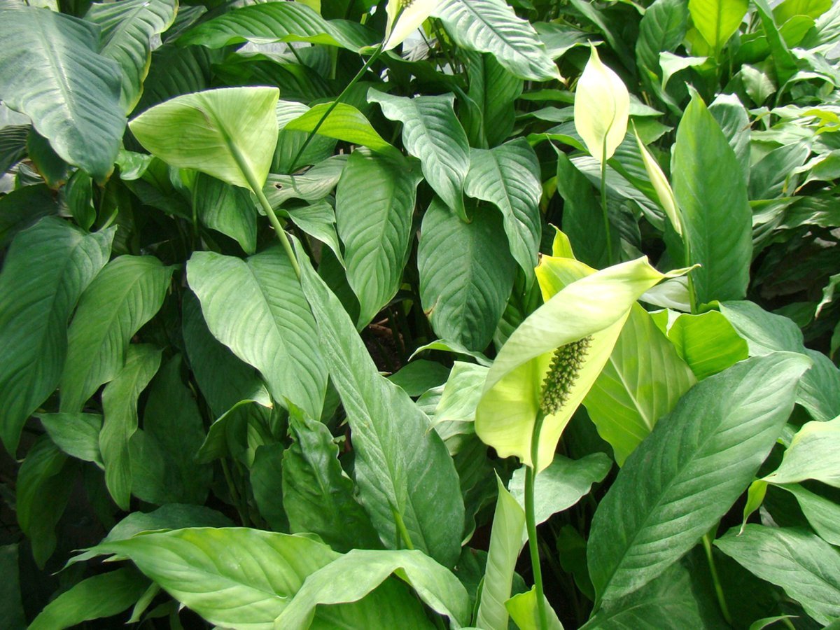 - Спатифиллум Уоллиса (Spathiphyllum wallisii) – всё растение высотой 30-40 см, коротким корневищем и розеткой темно-зеленых продолговато-ланцетных изящных листьев. Початок белый, покрывало узкое, втрое длиннее початка, сначала чисто-белое, затем зеленеющее. Цветение обильное, продолжительное. Растения неприхотливы, теневыносливы.