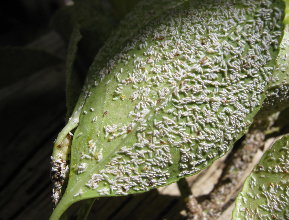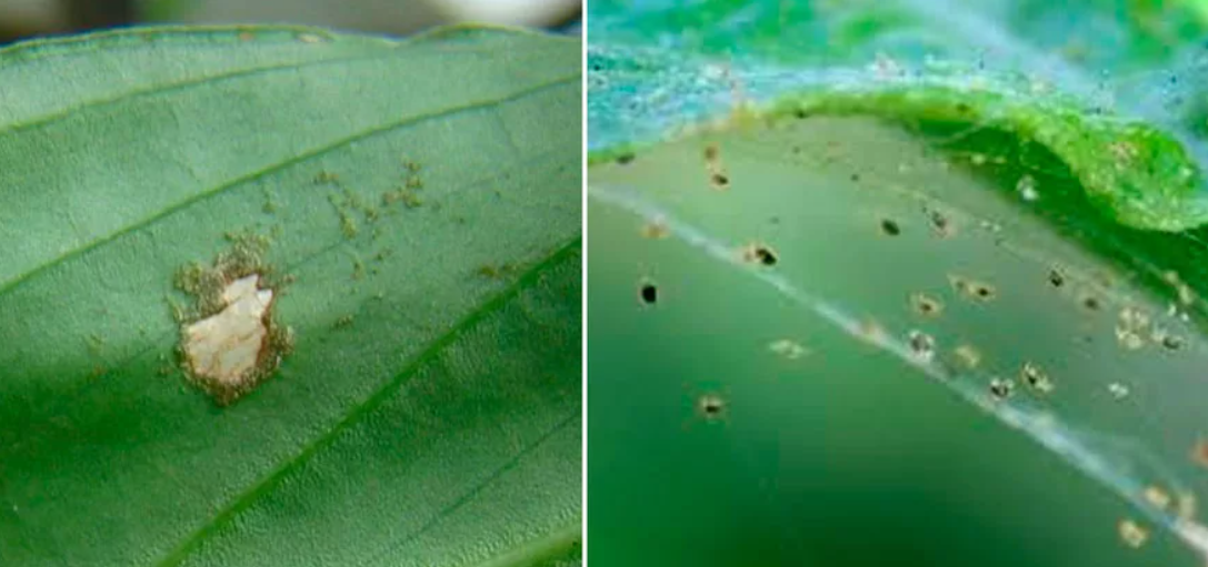 Насекомые хорошо прячутся между листьями, но выявить их можно по белым пятнам и налёту. Убрать вредителей можно вручную, а потом протереть листья спиртом, маслом.