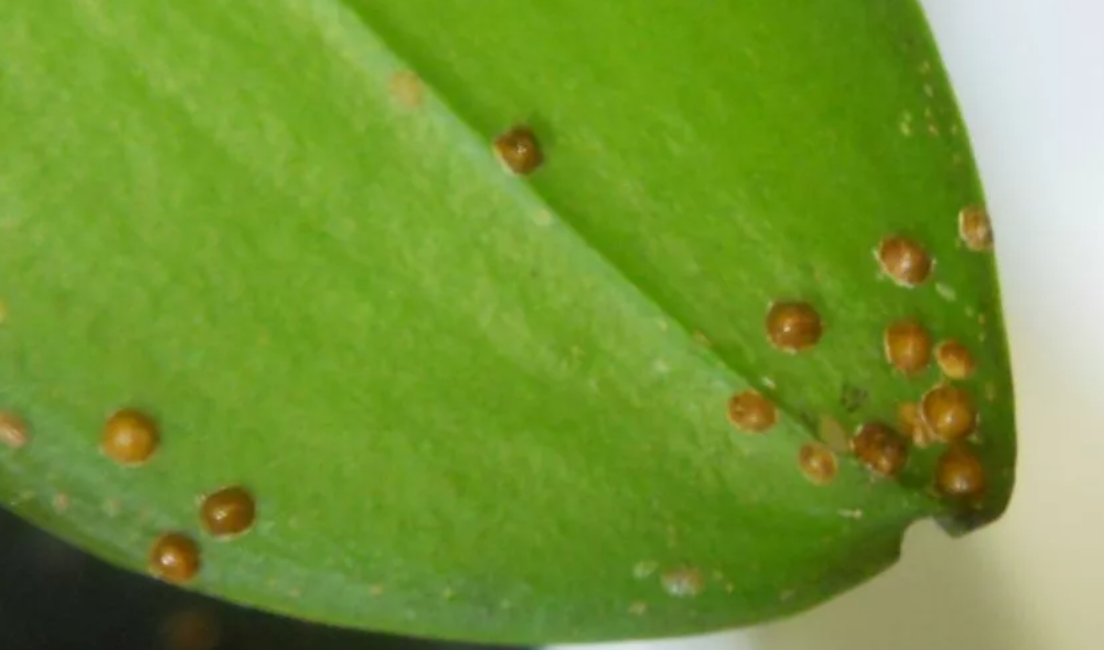 Домашняя щитовка. Также помогает обработка раствором никотин-сультфата. Спустя сутки растение моется мыльным раствором, почва поливается розовым раствором марганцовки.