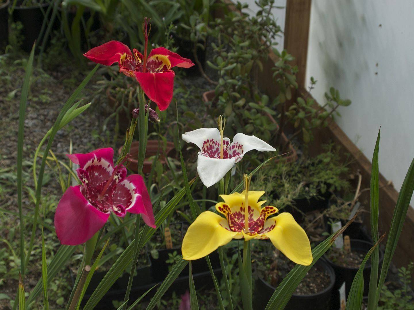 Спросом пользуется и сортосмесь «Тигридия Феррария микст» – растения высотой до 60 см с мечевидными листьями и цветками диаметром до 15 см с однотонными наружными лепестками красного, розовато-лилового, оранжевого, белого или желтого цвета и тремя внутренними лепестками с нарядными пятнами.