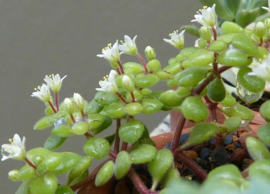 Большинство толстянок неохотно образует бутоны в домашних условиях, но есть виды, которые радуют своим цветением каждый год. В эту категорию можно отнести описанную выше почвопокровную крассулу точечную (C. Picturata) и колосовидную перфорату (C. Perforate).