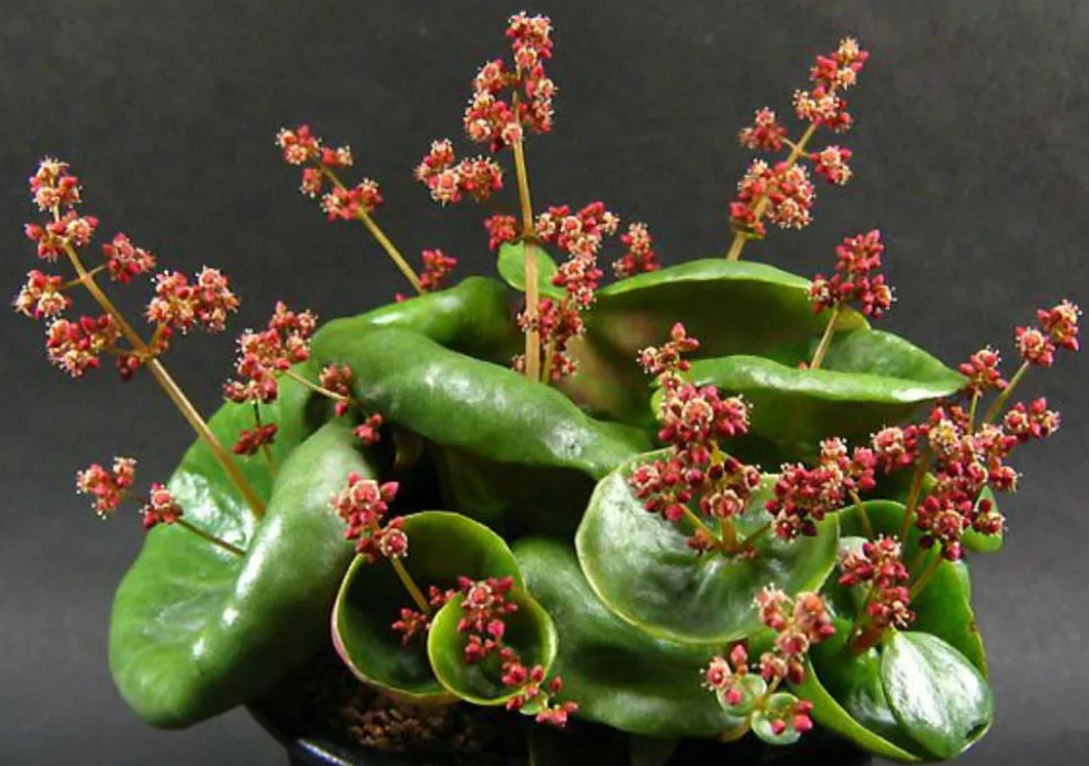 1-2 близко расположенные пары листьев срастаются, образуя круглую чашу глянцевого фисташкового цвета. Ее края могут смотреть вверх, либо быть отогнуты к низу. Это напоминает вогнутые листья кувшинок. Через их центр прорастает стебель, заканчивающийся метельчатым соцветием. Бутоны яркого красно-коричневого цвета, распускаясь становятся розовыми.