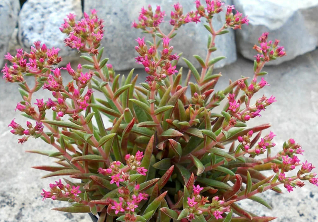 - Толстянка скальная – интересное растение с тонкими, ползучими, довольно короткими побегами. Листья серо-зеленые, интересно расположены. Очень оригинальный вид, который украсит домашнюю коллекцию суккулентов. Цветет мелкими цветками.