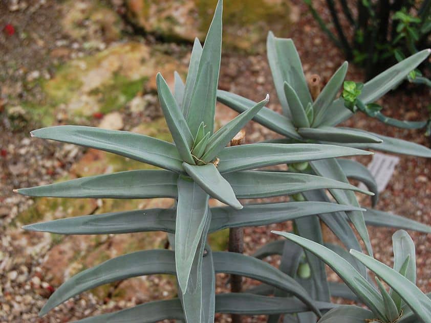 Расцветка варьируется от светло-зеленой до изумрудной. Кончики листьев часто приобретают красноватую окантовку, более яркую на молодой поросли. С ноября по апрель образуются длинные соцветия с множеством крошечных кремовых цветков.