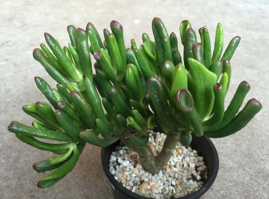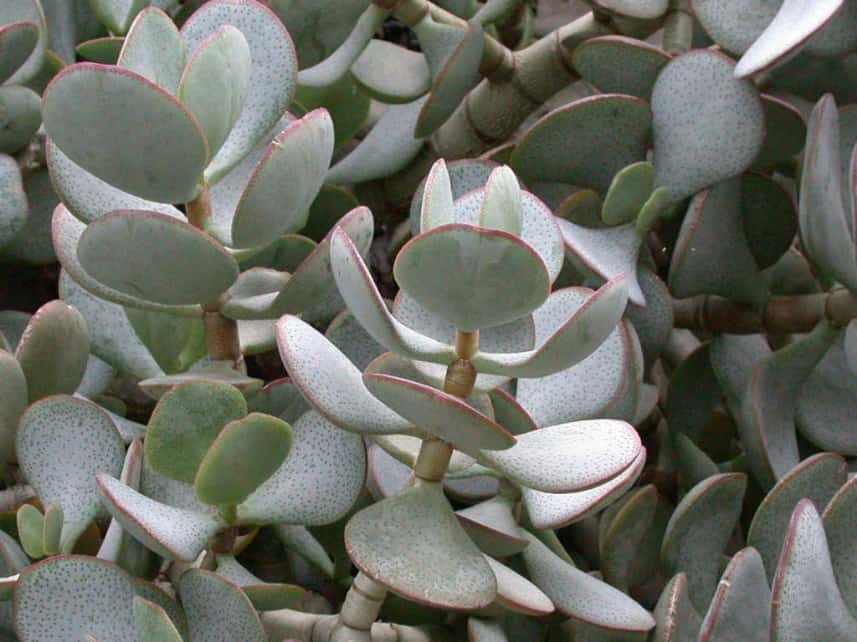 - Толстянка овальная (Crassula ovata). Еще один распространенный вид толстянок, схож с древовидной формой кроны и листьев, однако листья не имеют равномерной бордовой каймы.