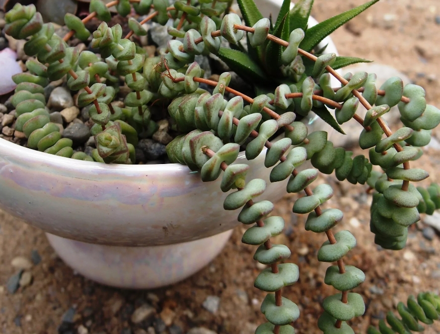 Миниатюрный маловетвящийся суккулент с листьями-шариками. Они салатового цвета с белыми точками налета, плотно охватывают стебель. Напоминают бусы. При должном уходе образуются цветки, собранные в метелку.