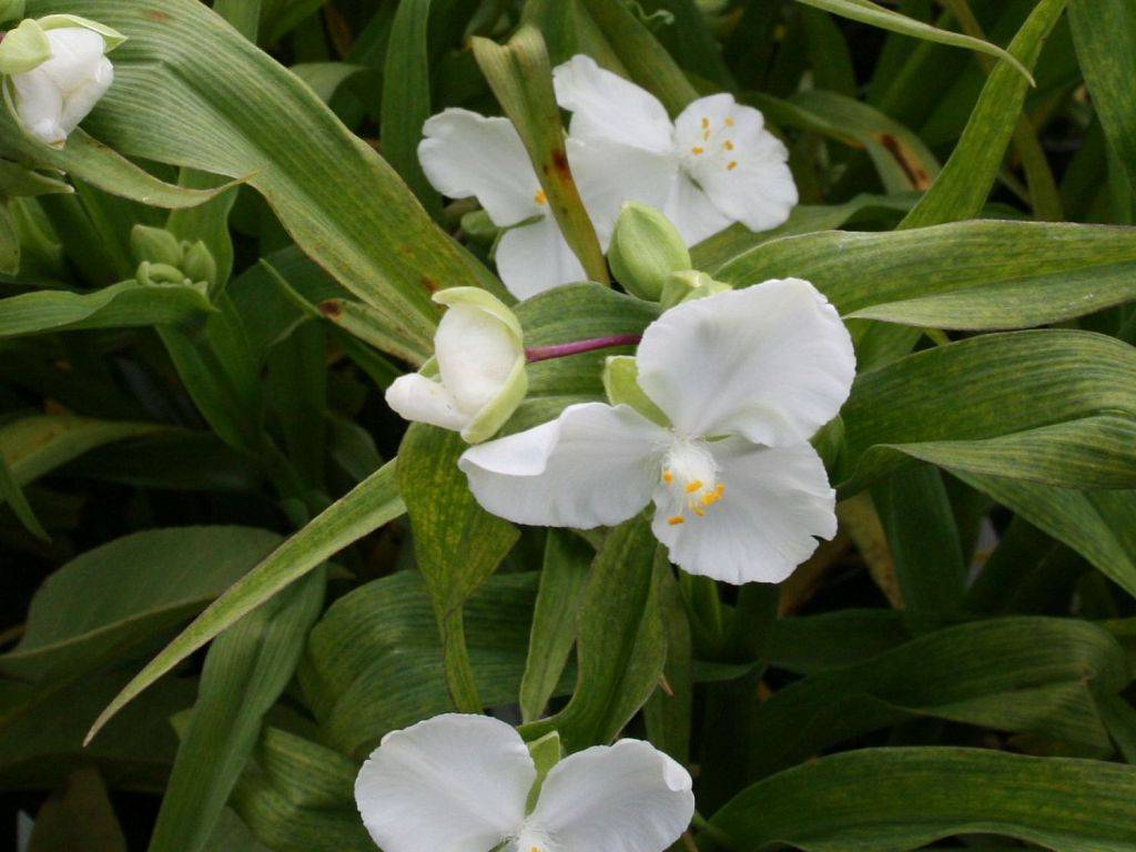 Традесканция белоцветковая. Гибкие побеги покрывают широкие яйцевидные или овальные листья. Пластинки 6 см длиной и 2,5 см шириной имеют заостренный край. Их поверхность гладкая, однотонная или пестрая, полосатая. На верхушках побегов формируются зонтичные соцветия с мелкими белыми цветами. Сорта: