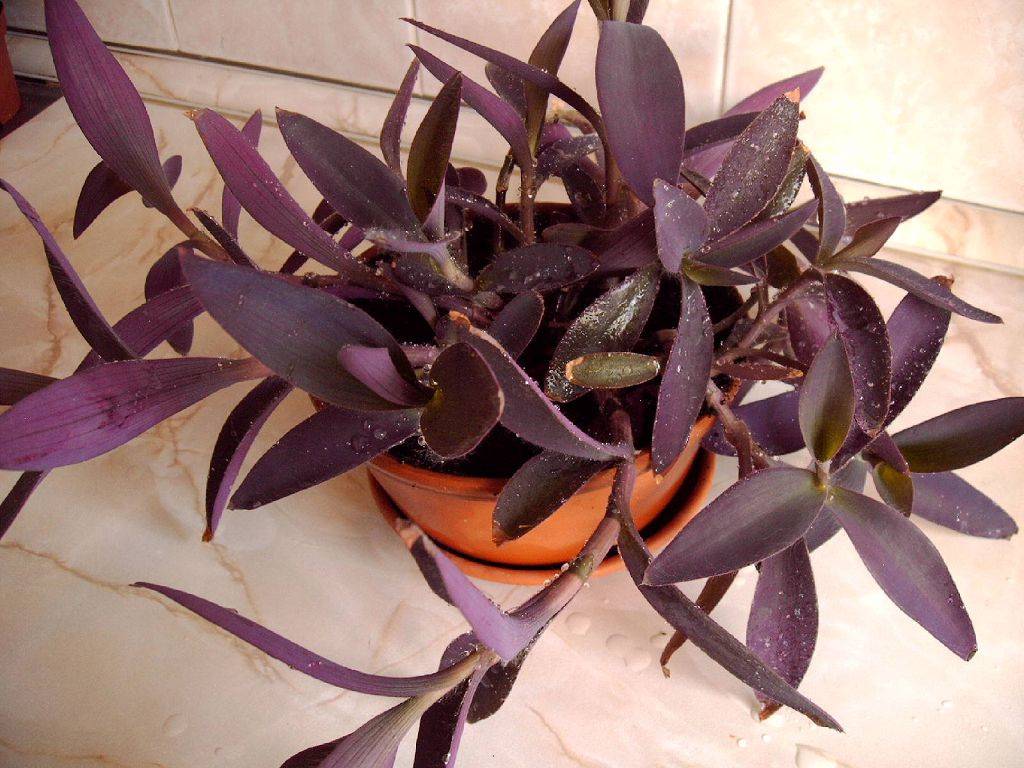 Традесканция фиолетовая. Травянистый многолетник с сильно разветвленными, прямостоящими или полегающими побегами. Стебли и листва имеют насыщенную лиловую окраску. Оборотная сторона листьев опушена. Мелкие цветы имеют 3 розоватых или малиновых лепестка.