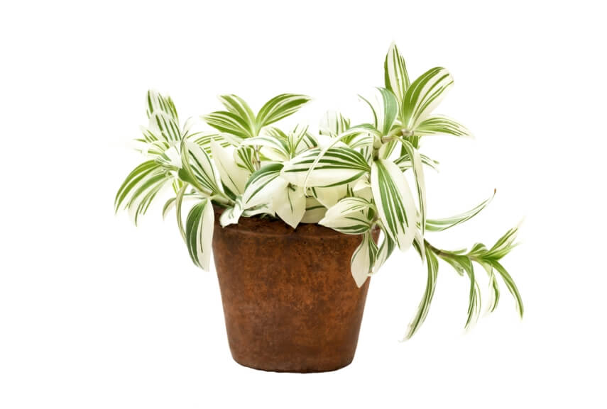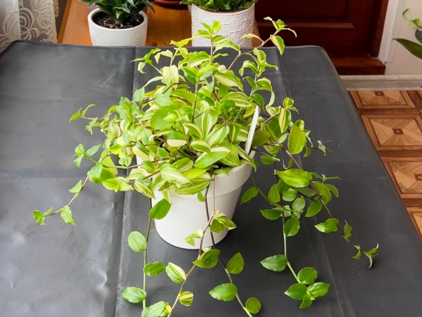 - Почему теряется вариегатность (variegated, что означает «пестрый», «пятнистый»)? Недостаточное освещение или неправильная обрезка. Если новые листья на традесканции начинают расти однотонными, то стоит переставить горшок ближе к свету. Но если после обрезки новые ветки растут полностью однотонными, то это говорит о том, что обрезка была проведена неправильно.