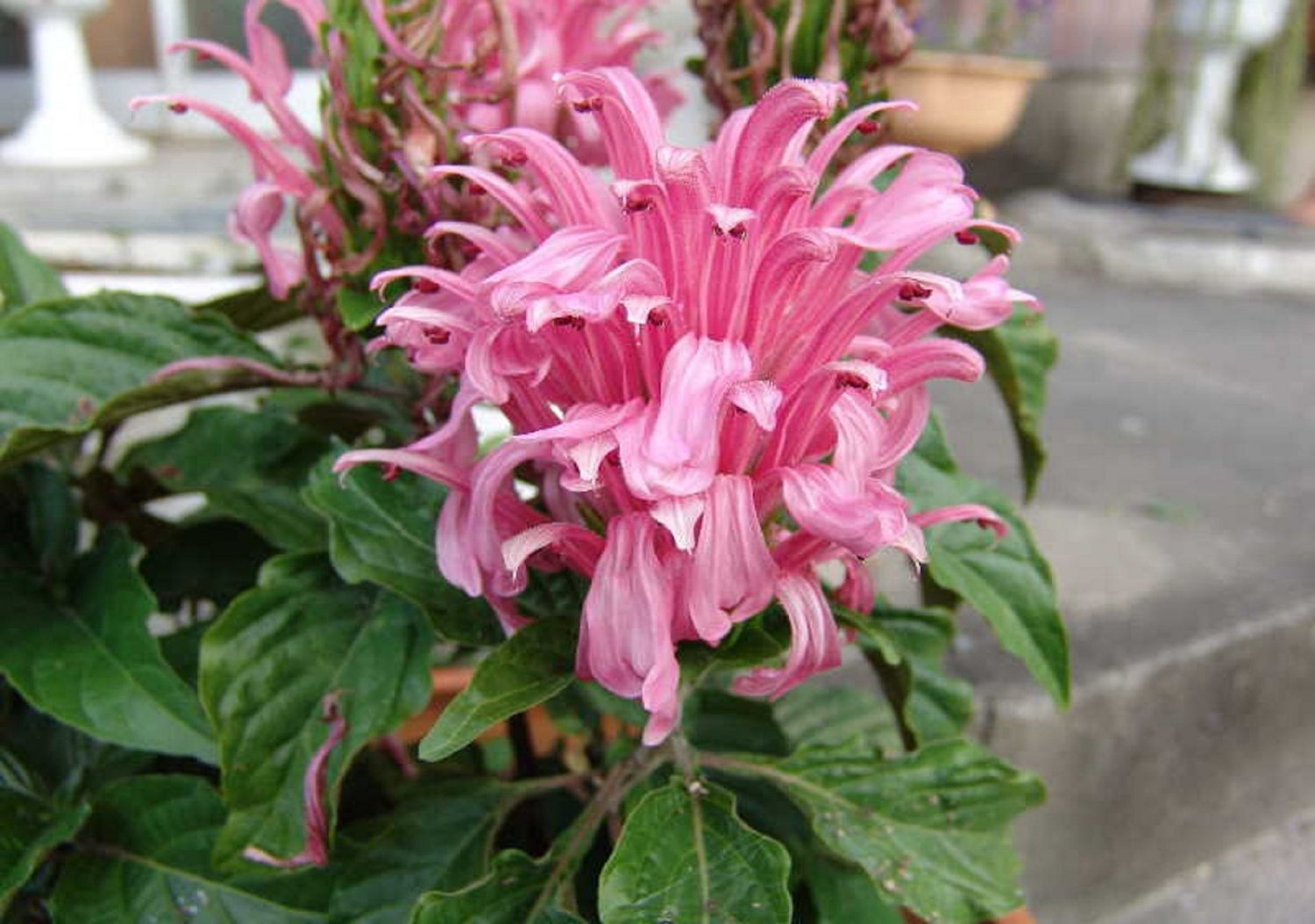 - Якобиния мясо-красная (Jacobinia carneа). Высота побегов достигает 0,8-1,2 м. Темно-зеленые овально-продолговатые листья немного опушены. Их длина достигает 15-20 см. С обратной стороны окрас листочков светло-зеленый. Цветы имеют ярко-розовый окрас, расположены наверху стеблей.