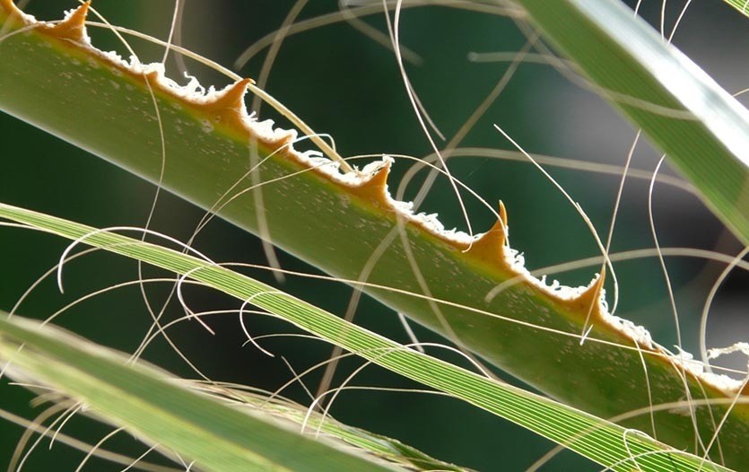 - На листьях есть длинные нити (как у юкки нитчатой), по которым вашингтонию можно отличить от других пальм. На черешках — крючковатые шипы.