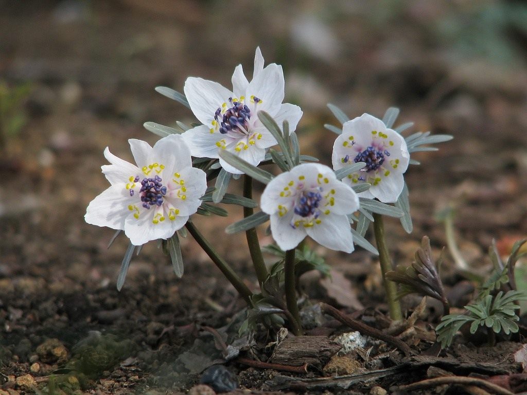 Имеет нарядные белые лепестки с желтыми нектарниками и тычинки необычного ультрамаринового цвета. Предпочитает некислую почву и представляет интерес для разведения в контейнерах.