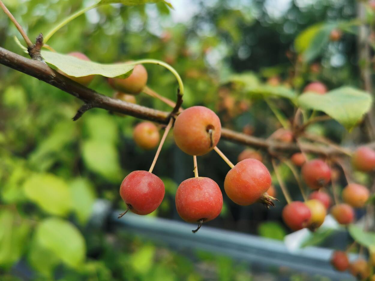 Плоды шаровидные, до 1 см в диаметре, желтые с красноватым оттенком, кисло-горькие на вкус яблочки. Созревают в сентябре и в течение всей зимы висят на дереве. При полном созревании легко раздавливаются и мякоть мажется. Семенные гнезда с твердыми оболочками. Плоды украшают дерево и зимой.