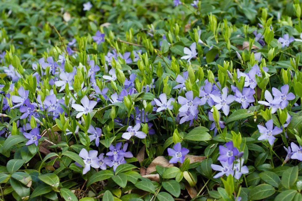 Полянка барвинка после цветения не теряет своей декоративности, украшая землю пышным ковром.