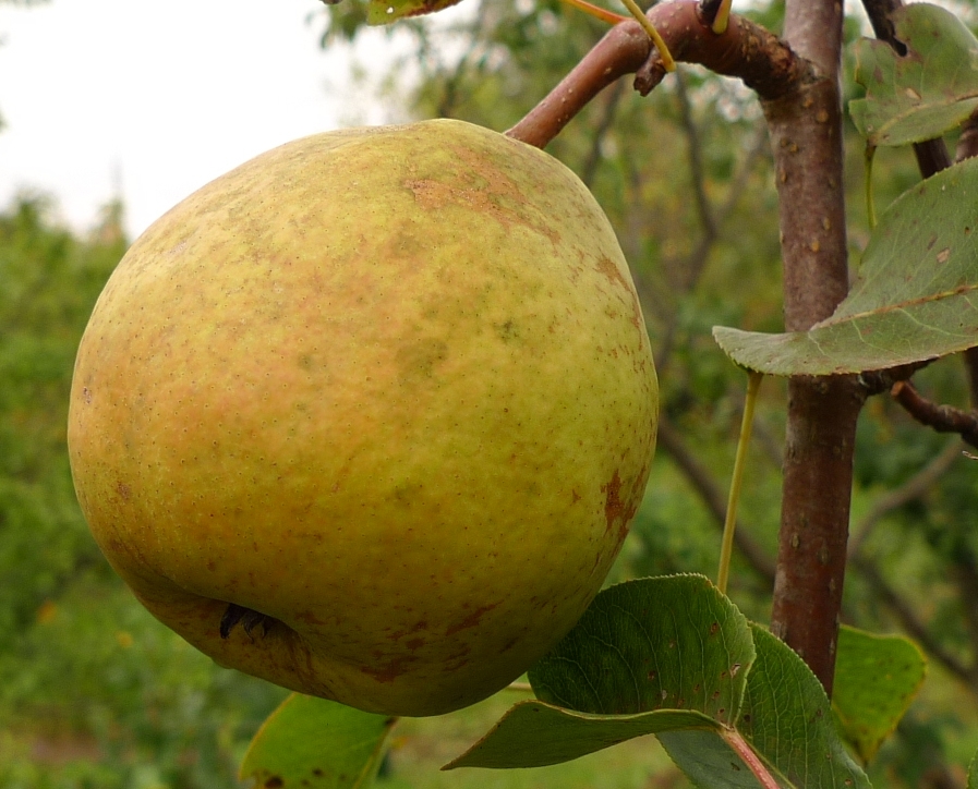 - Небольшие плоды, около 80 г. По форме напоминают конус. Жёлтый с зелёными вкраплениями цвет, поверхность матовая, уплотнённая. Мякоть сочная, хрустящая, со сладостью и лёгким кисловато-терпким привкусом. Сорванные фрукты, не портясь, могут лежать около 2 недель.