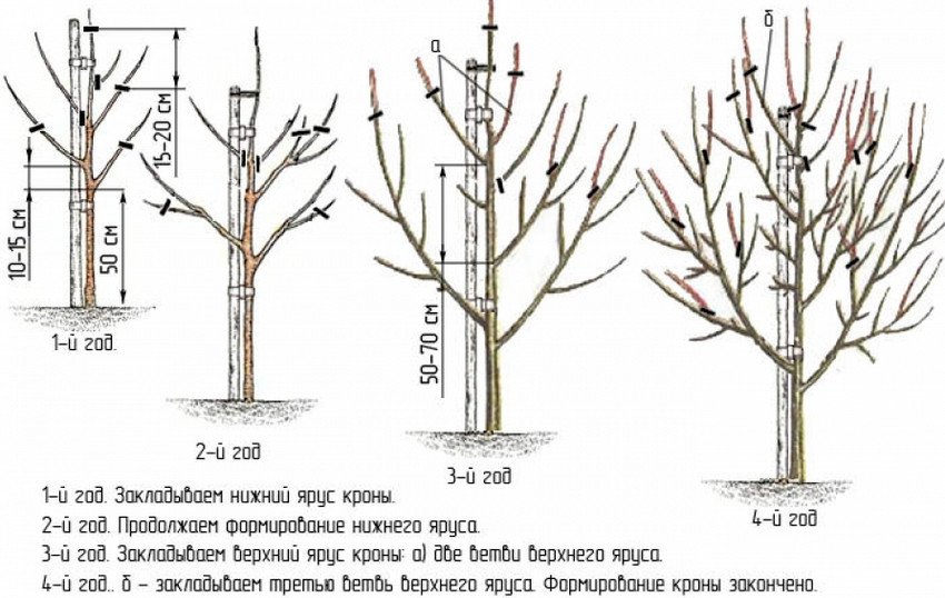 После первой обрезки, которая проводится в момент посадки, следует на протяжении нескольких лет формировать крону. Для этого обычно используется разреженно-ярусный способ, предполагающий наличие на стволе «поясов» из 2–3 направленных в разные стороны ветвей с расстоянием между ярусами в 50–70 см.