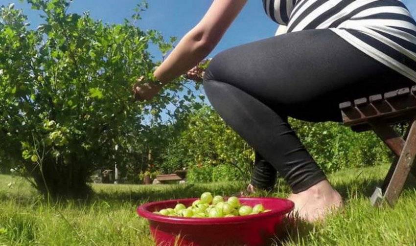Быстро собрать урожай поможет специальный механизм — электровибратор, питающийся от розетки или бортовой сети автомобиля. Под куст расстилают полиэтиленовую пленку. Затем на каждую ветку воздействуют вибратором. Ягоды отрываются и падают на настил. Правда, таким способом удобно собирать полностью созревшие плоды. Ягоды в стадии технической спелости не так легко сорвать с ветки при помощи вибратора. Опавший на пленку крыжовник нужно в тот же день очистить от листьев и перебрать.