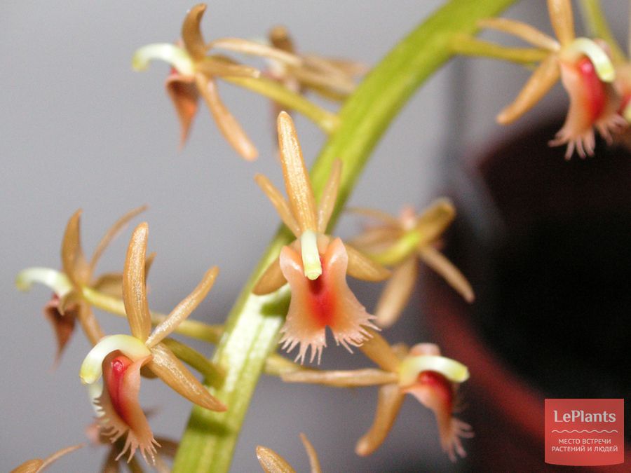 Миниатюрная разновидность, цветущая в желто-оранжевой палитре. По сравнению с размерами цветочно-лиственной части псевдобульбы имеют большой размер, что придает цветку необычный вид.