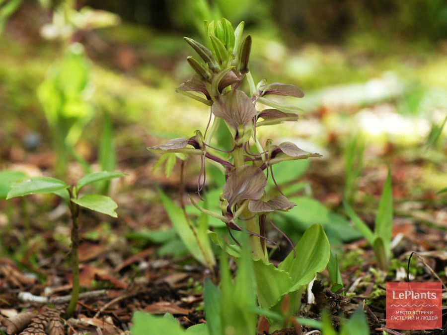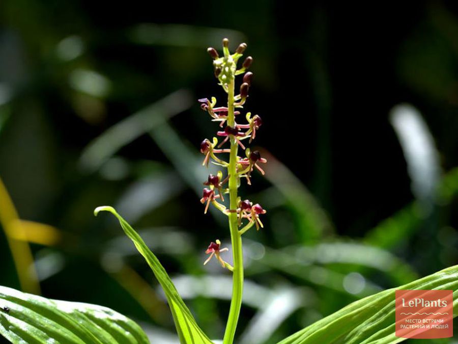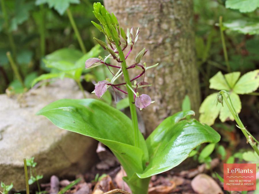 Липарис жилистый (L. nervosa) с зелено-фиолетовыми соцветиями и крупными листьями с глубокими продольными прожилками.