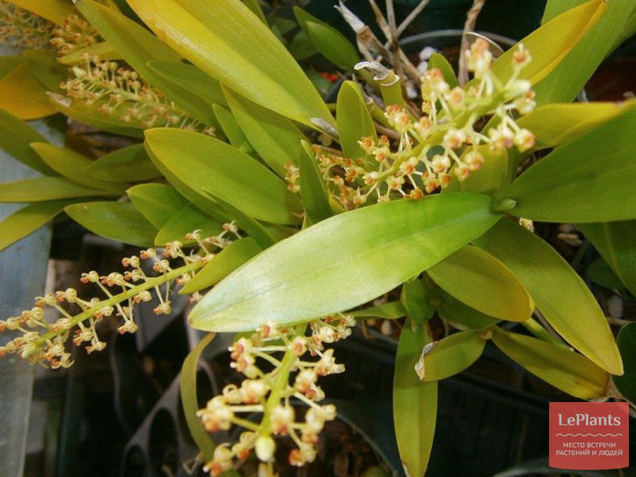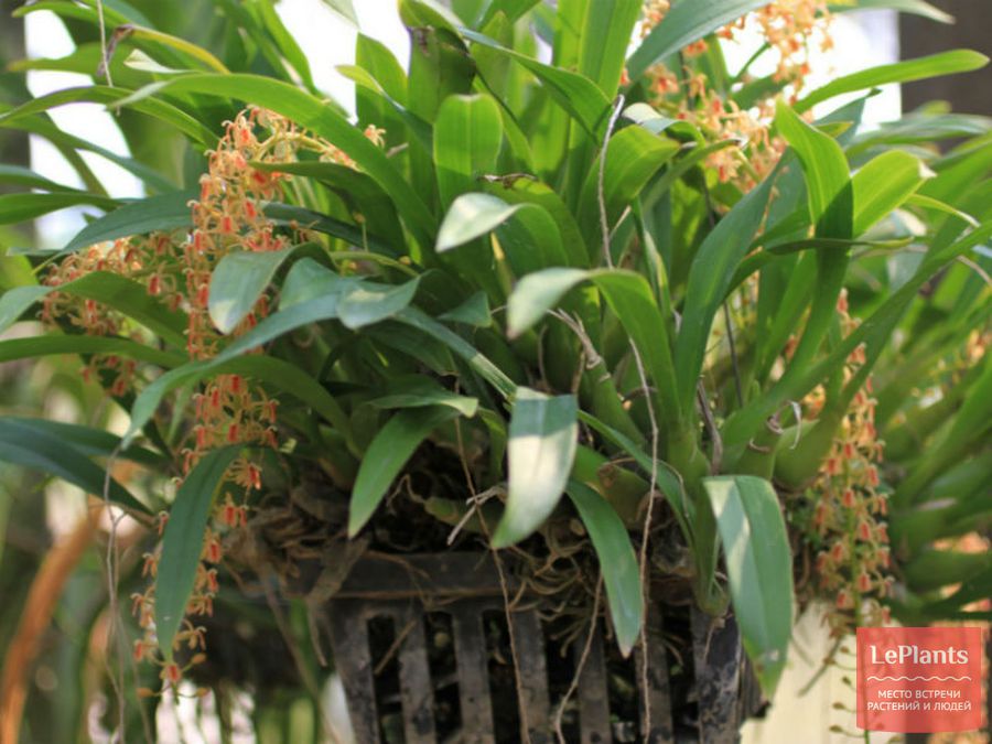 Среди растений этого вида есть и миниатюрные – до 12 см в высоту, и гигантские – до 1 м. Псевдобульбочки маленьких сортов имеют овальную форму, больших – тростникововидную. Толстые листочки на ощупь жёсткие.