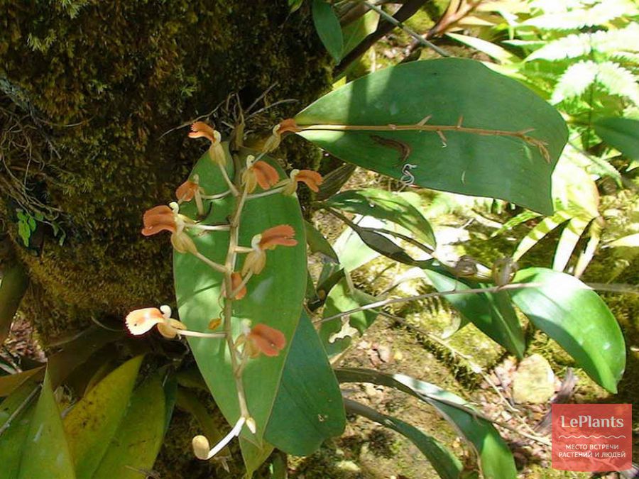 Эпифитная орхидея, требующая прохладного содержания. Псевдобульбы слегка морщинистые, темно – зеленые, глянцевые, слегка сжатые. Листья зеленые, глянцевые, с четко выраженными продольными прожилками, остроконечные. Цветки ароматные, достигают в диаметре 3 – 5 см., располагаются на коротких цветоносах и обладают коричневыми, бордовыми или зеленоватыми лепестками и светлой – почти белой губой.
