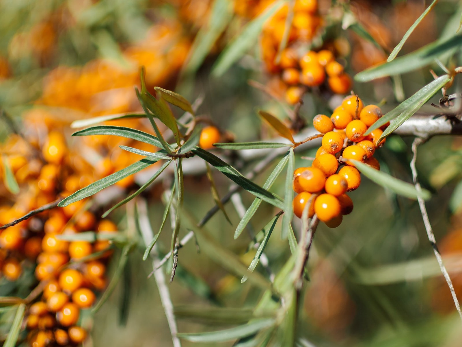 Эффектность кустам облепихи крушиновидной на всем протяжении вегетационного периода (с апреля по конец сентября) придают многочисленные побеги, покрытые большим количеством зелено-серебристой тонкой листвы